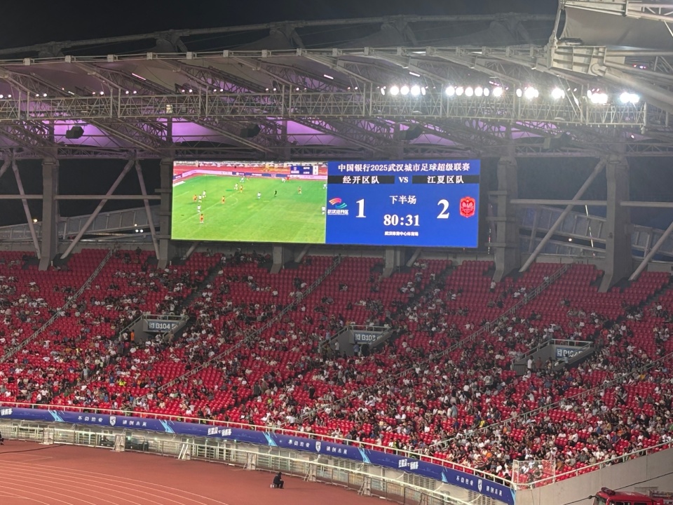 8月16日晚,2025武汉城市足球超级联赛(简称“汉超”)开幕式暨揭幕赛在武汉体育中心体育场举行,近5万名观众来到现场。最终比分1:2,江夏队获胜。